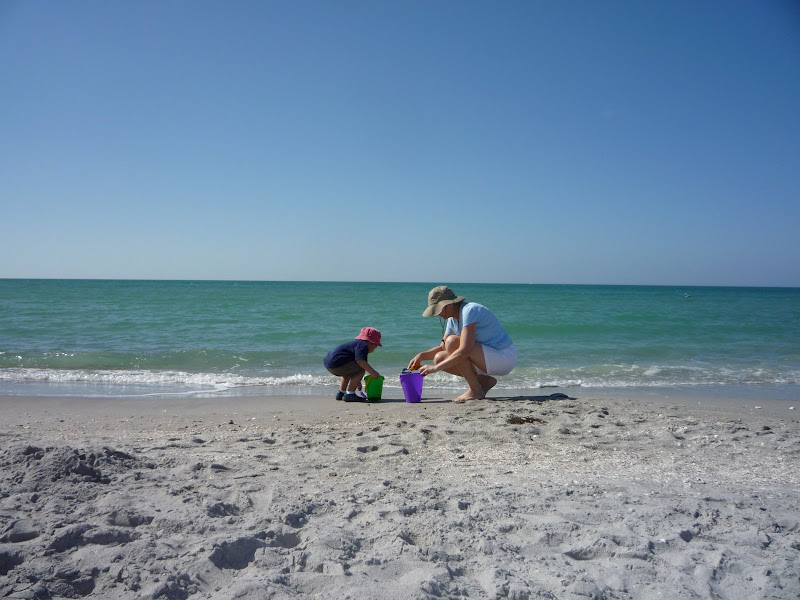 Well, I spent last week in Florida visiting my Mom who spends the winters there. Lucky her! But lucky us too for having a place to go! My son Isaac calls her Mimi and he is madly in love with her and misses her terribly when she is away, so he was really excited to get there! Here they are at Casperson beach in Venice...